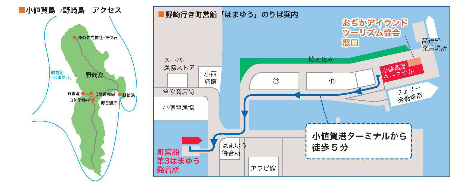 ・はまゆう乗り場は小値賀港フェリーターミナルより徒歩5分です。・往路は途中「六島」を経由します。 ・片道500円(小学生以下250円)。お支払は船内でお願いします。